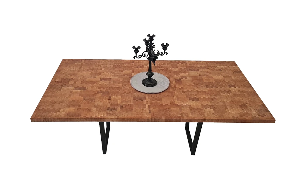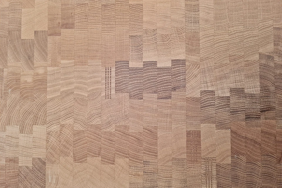 The end grain panel is made of square/rectangular blocks which vary in size 20-60mm in length and width.